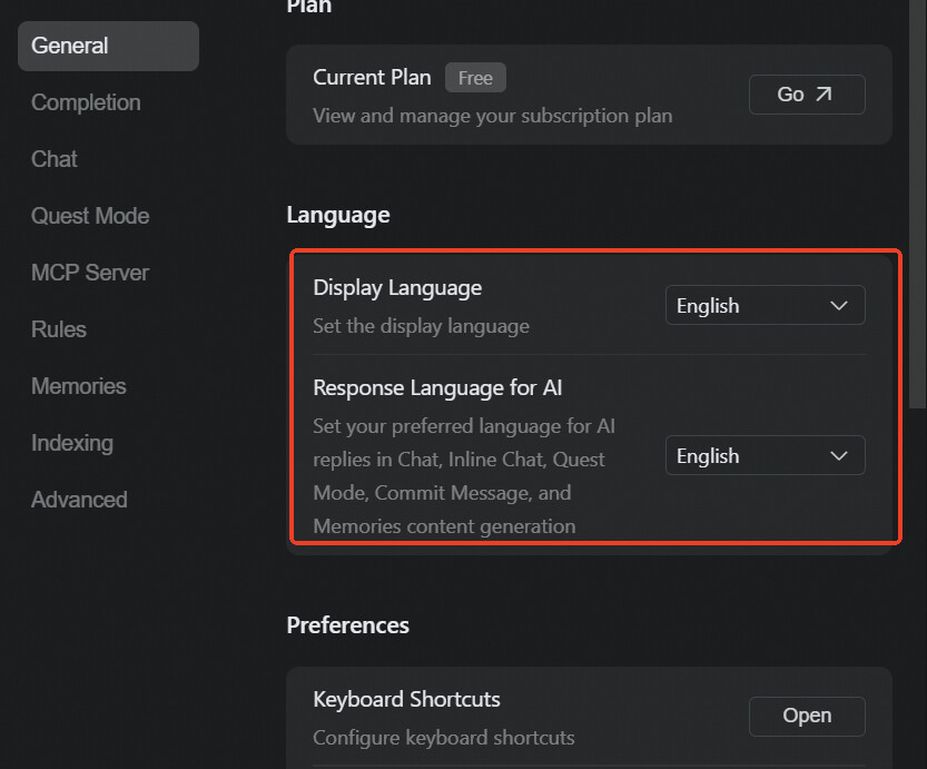 Even though English is selected as the language in Qoder, the AI Chat panel responds in Chinese.