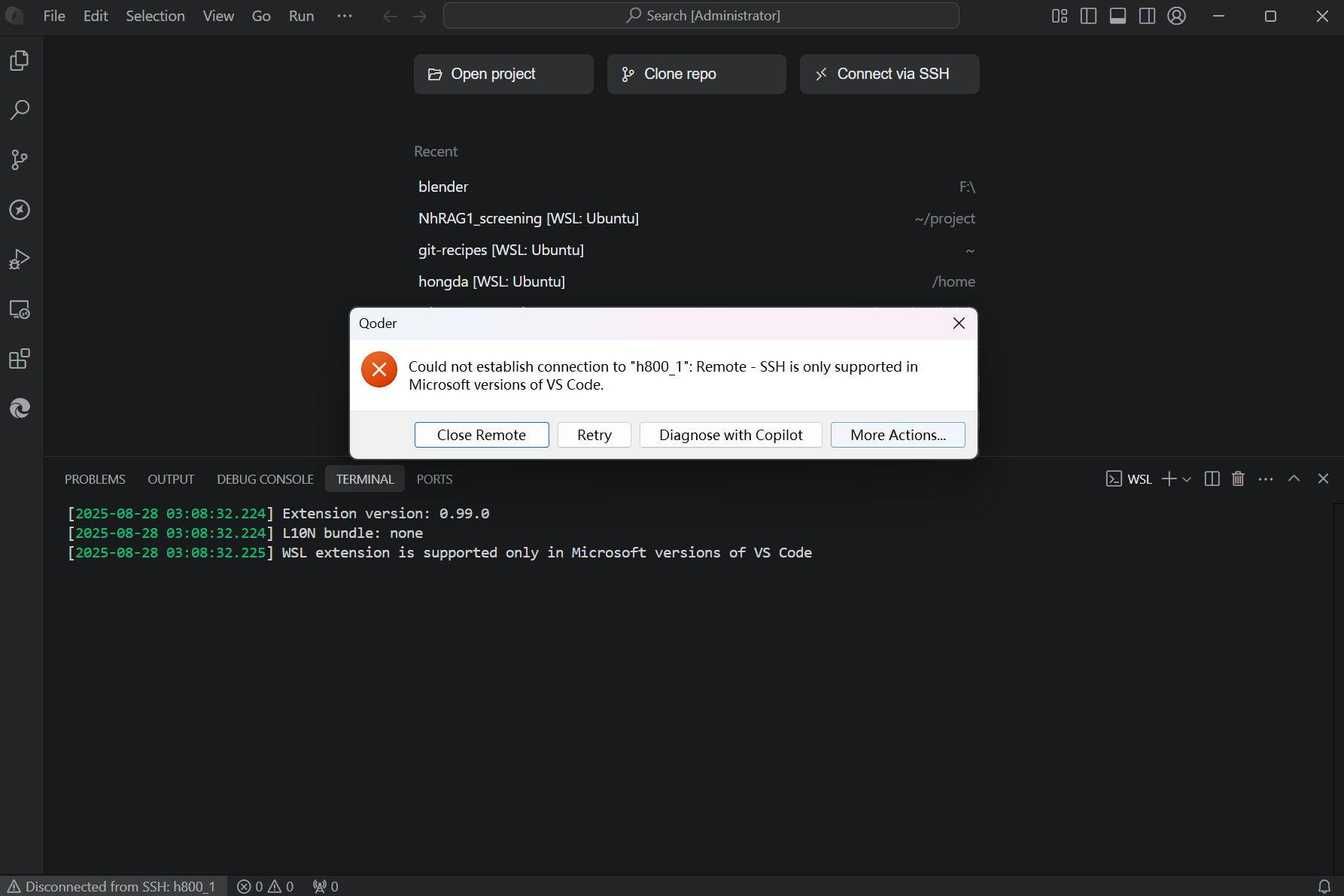 Error: “Could not establish connection. Remote SSH is only surpported in Microsoft versions of VS code“