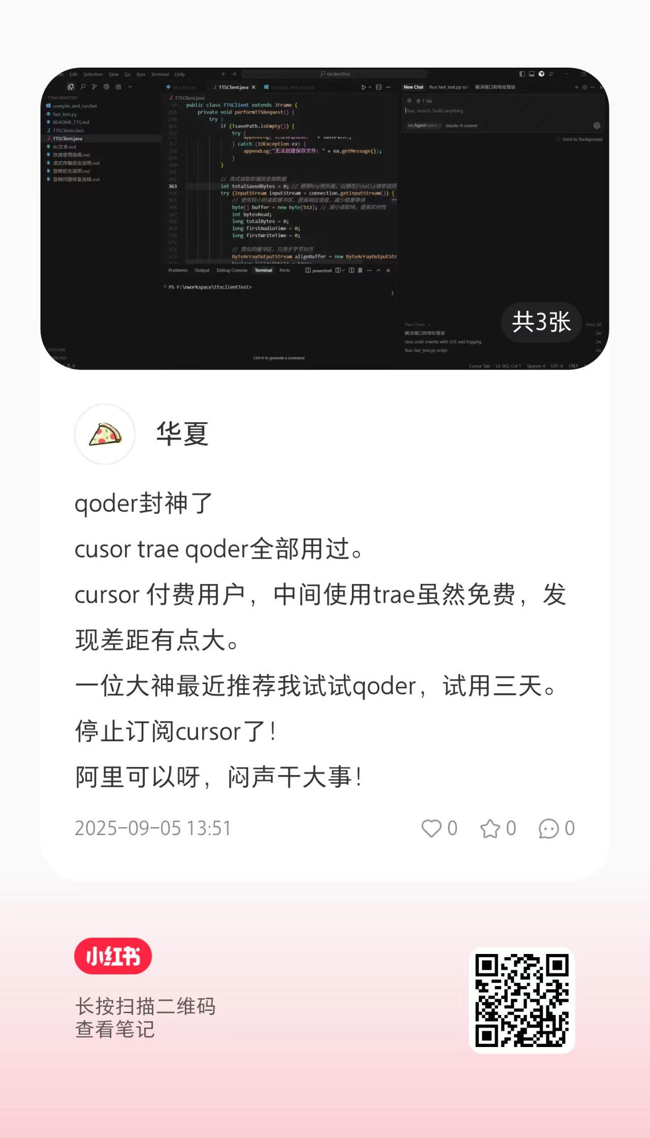 qoder封神了 cusor trae qoder全部用过。 cursor 付费… http://xhslink.com/o/36UGsfw9Ppg