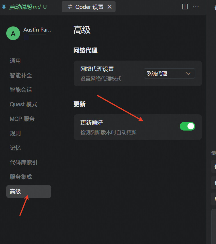 是的 自动更新的 可以看下Qoder右上角 是否出现更新按钮,没有出现的话检查下右上角Qoder设置自动更新是否打开: